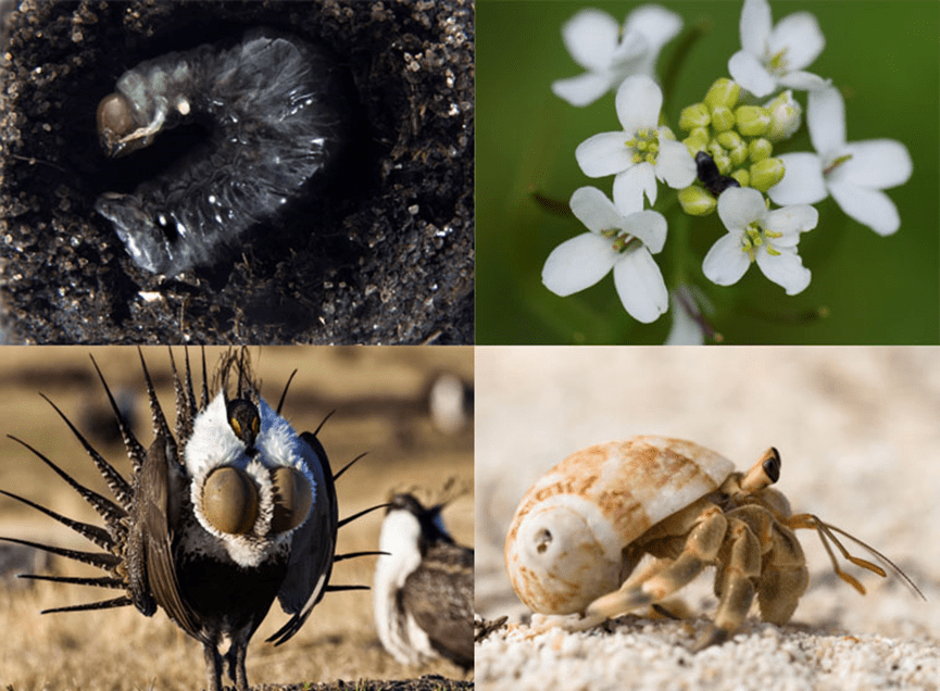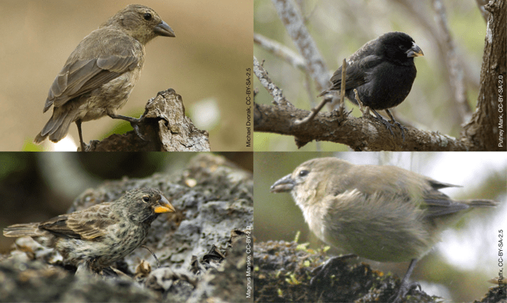 在两次迁入事件中重复演化出飞行退化表型的白喉秧鸡[32](Dryolimnas cuvieri,左上),和作为适应辐射案例而为人熟知的达尔文雀(左下)。它们是叙述传统演化故事的完美对象