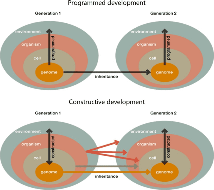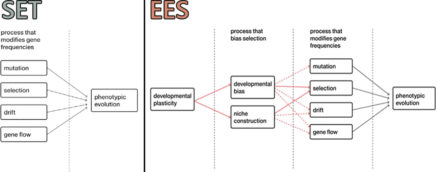A.在忽视表型对环境反作用的情形下,环境如何随时间演化至此成了系统的外部变量,缺乏生物学意义。生物的性状影响下一代性状的方式只剩下遗传物质。因此,在研究演化时,发育可以被视为黑箱。B.扩展演化综论强调发育和行为对环境的反作用[26],从而将发育和生态的事实纳入进来。文化遗传也是一种生态位构建。人类发展为农耕文明后,生活环境和生产方式发生巨大变化,包括定居,食用驯化后的动植物等等。这种文化,一方面放松了对某些基因的选择,一方面加强了对淀粉消化、蛋白代谢等方面基因的选择。
