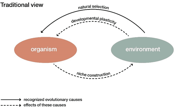 例如,在涉及生物和环境的关系时,演化生物学家们或许习惯于做“远因”与“近因”的区分,并以“基因与环境制造表型,环境筛选有利表型,种群基因频率改变”的方式叙事。而扩展演化综论者认为,这样的叙事会让人习惯性地以基因为中心思考,并将环境作为一成不变的背景板或竞技场,而忽略了生物是环境的重要组分,而前者又处于动态的变化和交互之中。此外,生物对环境的积极修改,通常会放大有利于自己生存的因素——这使得生物“构建”的环境与自然环境存在系统性差异。
