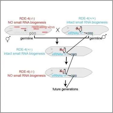 一项研究表明,线虫当中小干扰RNA介导的病毒沉默效应可以以非孟德尔方式遗传,通过杂交RNAi通路缺陷和RNAi通路完善的线虫,再自交后选择后代中RNAi通路缺陷的线虫进行观测,发现由于在遗传过程中线虫继承了亲本的viRNA,所以即使自身不具备完善的RNAi能力,但同样可以通过viRNA干扰病毒复制的过程,从而产生病毒抗性。这样的病毒抗性至少在五十代后仍然可以观测到。