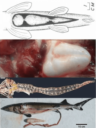 单腔室的鱼鳔,上图为斑点叉尾鮰的鳔[1];中下图为中华鲟[2]的鳔