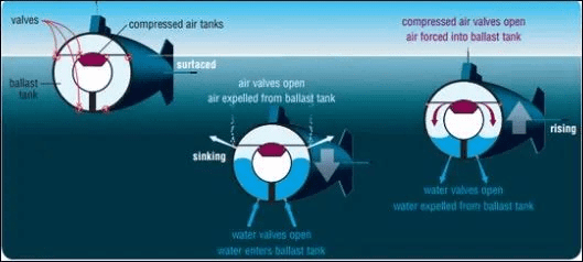 在鱼类浮潜原理的启发下,人类仿照双腔室鱼鳔发明了潜水艇的压载系统。压载系统的压水舱(ballast tank)对应鳔的前室,它是调节浮力的主要结构,其排除和吸纳海水的过程就类似鱼鳔的收缩和充气。压载系统的压缩空气仓(compressed air tank)则很像鳔的后室,平时存储高压空气,需要上浮时则释放气体、压出海水来获得更大浮力。值得一提的是,潜艇由于压水舱体积比较大,能调节的浮力范围也较广。但是一般情况下,还是通过调整潜艇姿态,利用螺旋桨来获得动力的。毕竟潜艇长时间在水下执行任务,压缩空气是非常很珍贵的,用一点就会少一点。