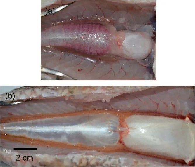 单带红脂鲤(Hoplerythrinus unitaeniatus)的鳔(a)和虎利齿脂鲤(Hoplias malabaricus)的鳔(b)[4],