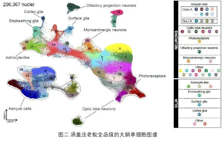 该研究获得了涵盖法老蚁工蚁、处女繁殖蚁、蚁后、雄蚁4种全品级大脑总共206,367个高质量的单细胞核转录组数据。这是世界上首个全面覆盖一个蚂蚁社会中所有分工角色的单细胞图谱(图二)。