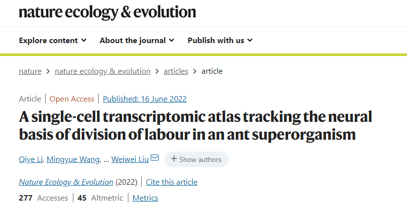 研究成果近日以“A single-cell transcriptomic atlas tracking the neural basis of division of labour in an ant superorganism”为题发表于Nature Ecology and Evolution。